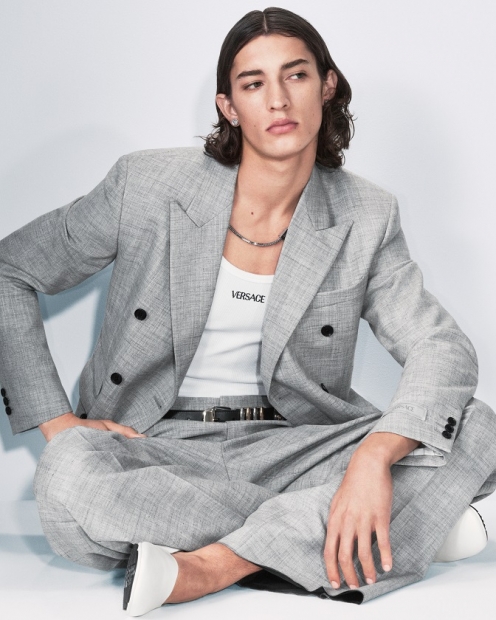 西裝以夏季羊毛製成,令輪廓更加柔和,同時透過細節保留Versace一貫的懾人力量,例如以迷人金色或銀色金屬打造的Medusa'95 標誌,又或男裝外套背面的印花絲質拼布。在過去幾季出現的粗花呢外套、上衣、半截裙和短褲換上更輕巧的設計,以柔和的淺粉紅色和米白色呈現。新款褶襇連身裙配以領花細節和巴洛克圖案,披上淺粉紅色、杏色或灰藍色。華麗奪目的晚裝款式包括採用Versace 標誌性金屬網布的晚禮服,以及選用日本天然珍珠、銀色亮片和水晶刺繡海星圖案的直身晚裝。
